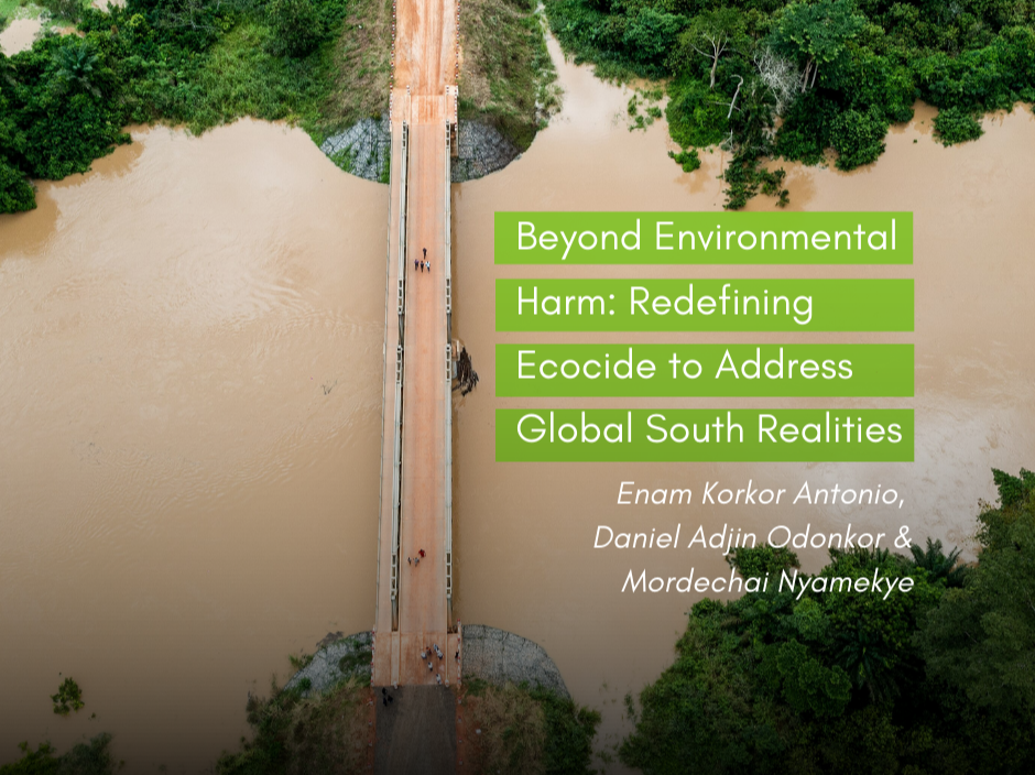 Enam K. Antonio, Daniel Adjin Odonkor & Mordechai Kwaku Nyamekye’s article 𝘉𝘦𝘺𝘰𝘯𝘥 𝘌𝘯𝘷𝘪𝘳𝘰𝘯𝘮𝘦𝘯𝘵𝘢𝘭 𝘏𝘢𝘳𝘮: 𝘙𝘦𝘥𝘦𝘧𝘪𝘯𝘪𝘯𝘨 𝘌𝘤𝘰𝘤𝘪𝘥𝘦 𝘵𝘰 𝘈𝘥𝘥𝘳𝘦𝘴𝘴 𝘎𝘭𝘰𝘣𝘢𝘭 𝘚𝘰𝘶𝘵𝘩 𝘙𝘦𝘢𝘭𝘪𝘵𝘪𝘦𝘴 𝘵𝘩𝘳𝘰𝘶𝘨𝘩 𝘎𝘩𝘢𝘯𝘢’𝘴 𝘐𝘭𝘭𝘦𝘨𝘢𝘭 𝘔𝘪𝘯𝘪𝘯𝘨 𝘊𝘳𝘪𝘴𝘪𝘴 argues that current definitions of ecocide inadequately address the environmental and socio-economic realities of the Global South. Using Ghana’s illegal gold mining (galamsey) crisis as a case study, the authors propose an expanded definition that includes harm to human livelihoods, health, and fundamental rights.